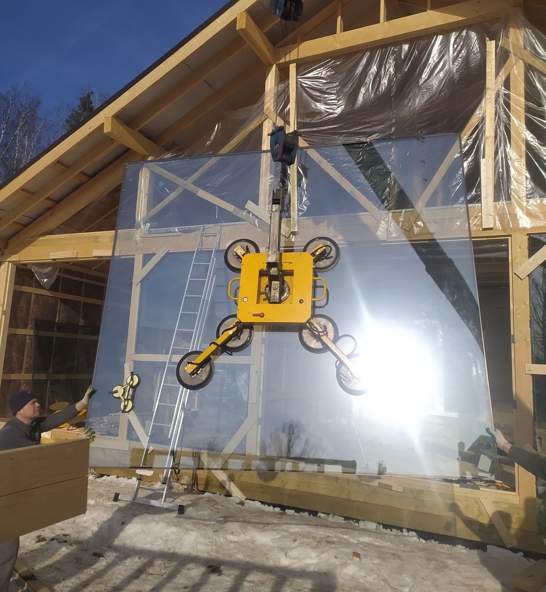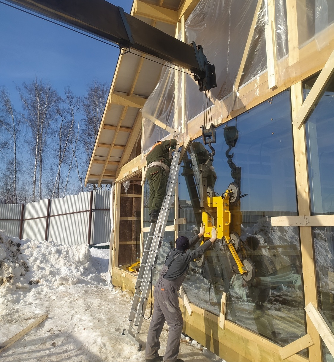 Монтаж стеклопакетов мини краном внутри дома